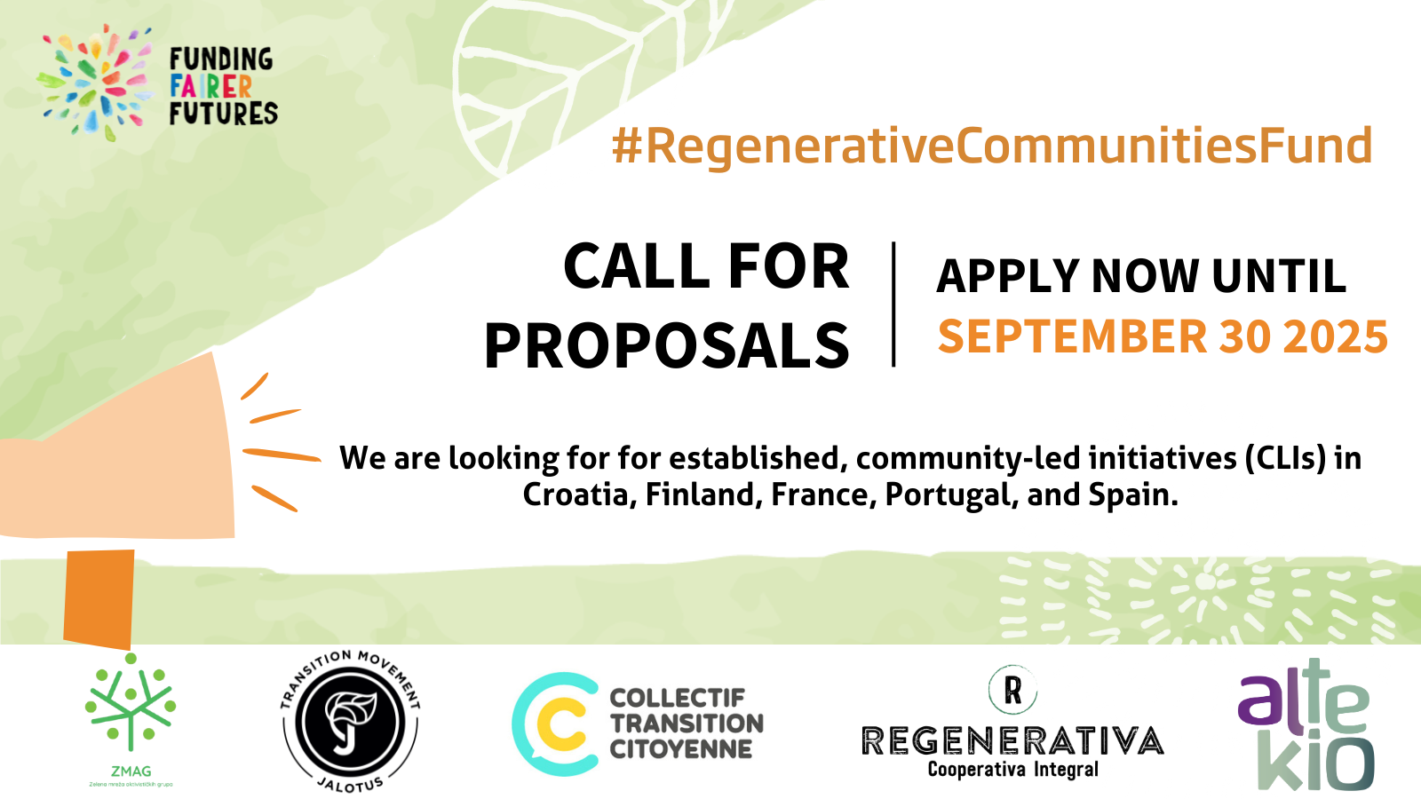 Regenerative Communities Fund (RCF), on ECOLISEn vuonna 2024 alulle laittama aloite, joka käynnistää nyt toisen rahoituskierroksen uudistavien yhteisövetoisten hankkeiden tukemiseksi. Tässä haussa valitaan 15 Demonstrator-hanketta tai yhteisövetoista toimijaa Kroatiasta, Suomesta, Ranskasta, Portugalista ja Espanjasta.
